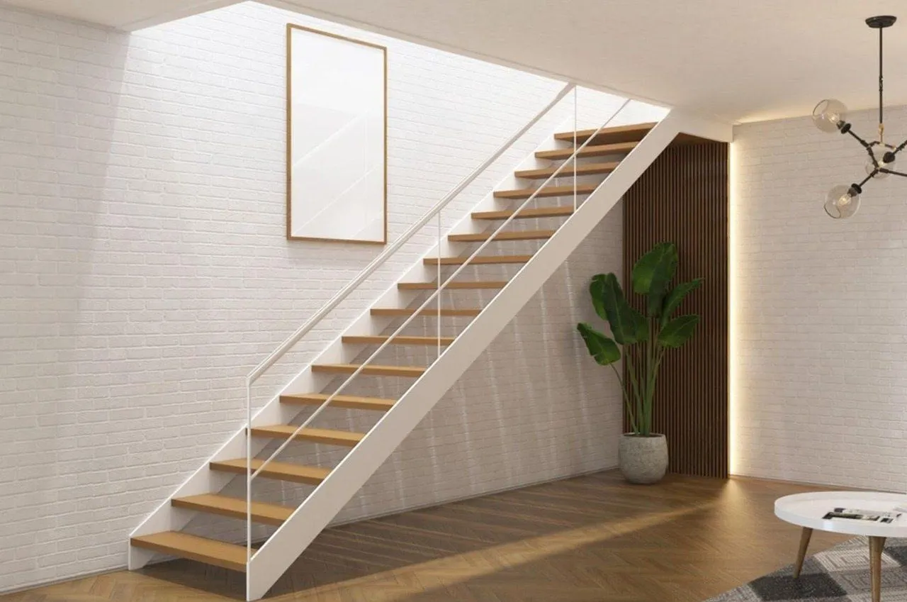 Визуальная легкость. За счет центральной балки и отсутствия подступенков конструкция выглядит «воздушной», не утяжеляет интерьер и пропускает максимум естественного света.